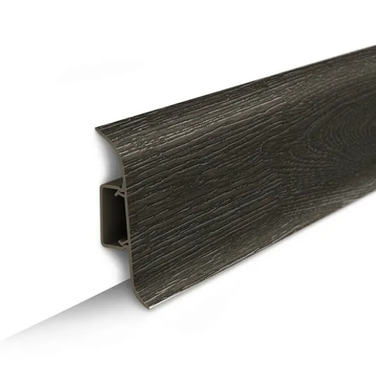 Сделаны плашки из ПВХ. Этот материал хорошо сочетается с любым стилевым оформлением комнаты, гармонирует с разными настенными, напольными и потолочными покрытиями. Оттенок Темный вписывается в разное цветовое оформление пола, становясь тем самым акцентом, который делает напольное покрытие законченным. Плинтус можно укладывать с полами из ламината, линолеума, досок, ковролина, подбирая цвет под оттенок половиц или играя на контрасте.