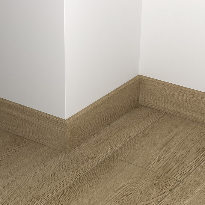 Монтаж плинтусных плашек прост. Все элементы соединяются с помощью замков, так что сбор обрамления не займет много времени. На нижней поверхности плашек есть выемки, в которые можно уложить провода, тонкие трубы. Так можно скрыть коммуникации, проходящие вдоль стен.