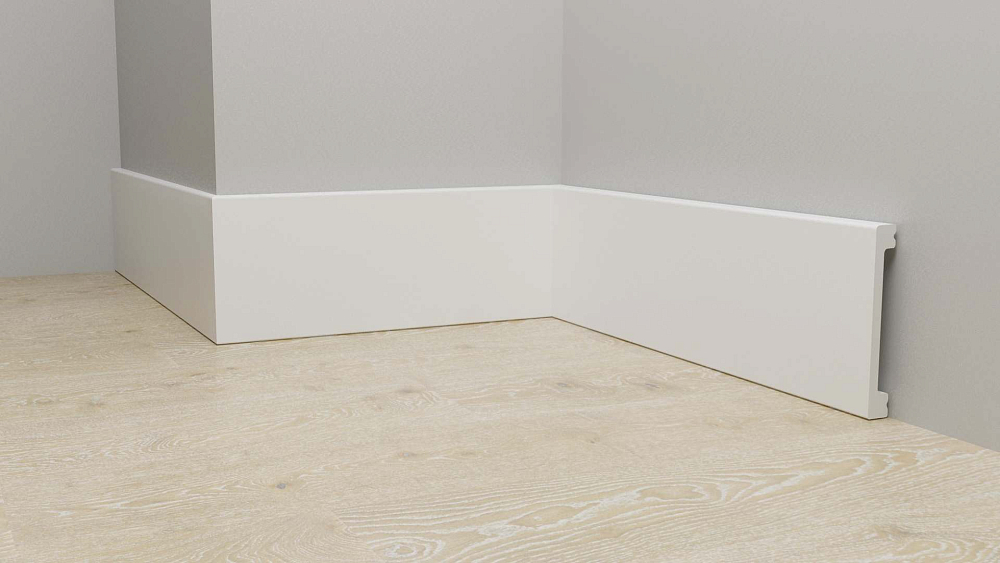 Монтаж плинтусных плашек прост. Все элементы соединяются с помощью замков, так что сбор обрамления не займет много времени. На нижней поверхности плашек есть выемки, в которые можно уложить провода, тонкие трубы. Так можно скрыть коммуникации, проходящие вдоль стен.