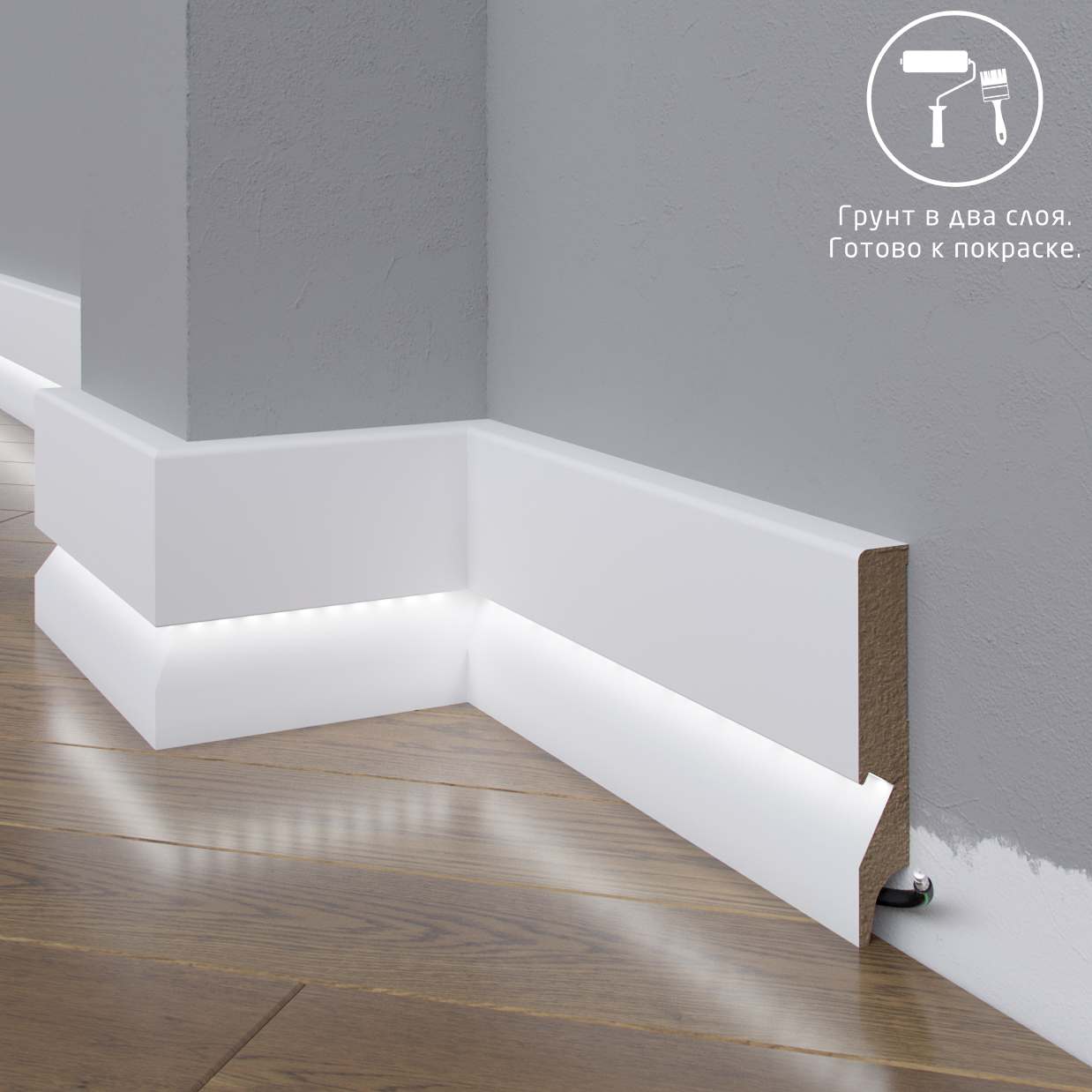 Монтаж плинтусных плашек прост. Все элементы соединяются с помощью замков, так что сбор обрамления не займет много времени. На нижней поверхности плашек есть выемки, в которые можно уложить провода, тонкие трубы. Так можно скрыть коммуникации, проходящие вдоль стен.